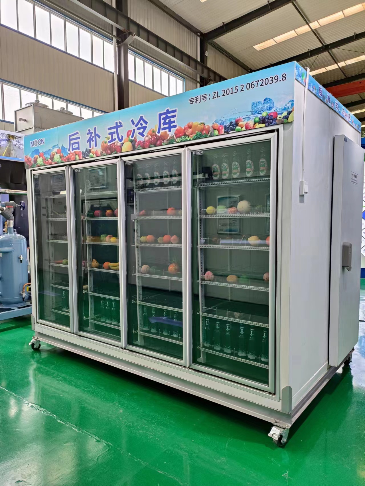 后补式冷库具备展示及储存功能,是占地面积小的多用途冷库。传统的冷库只有销售货架和库门,顾客取货和理货员补货共用一扇库门,后补式冷库具有一个冷藏室,冷藏室的前部设置有销售货架,在冷藏室的后部设置有补货货架,在销售货架和补货货架之间设置理货通道,冷藏室侧面开设补货门,补货门与理货通道相通,理货员在理货时可以不影响和干扰顾客的选购,同时,补充的货物由于事先是放置于处于同一温度下的补货货架上,因此,可以保证商品温度的一致性。冷藏室前端设有玻璃门,方便顾客选购商品的同时,而且不受店内空调及其他设备影响,冷却性能稳定,更节能。